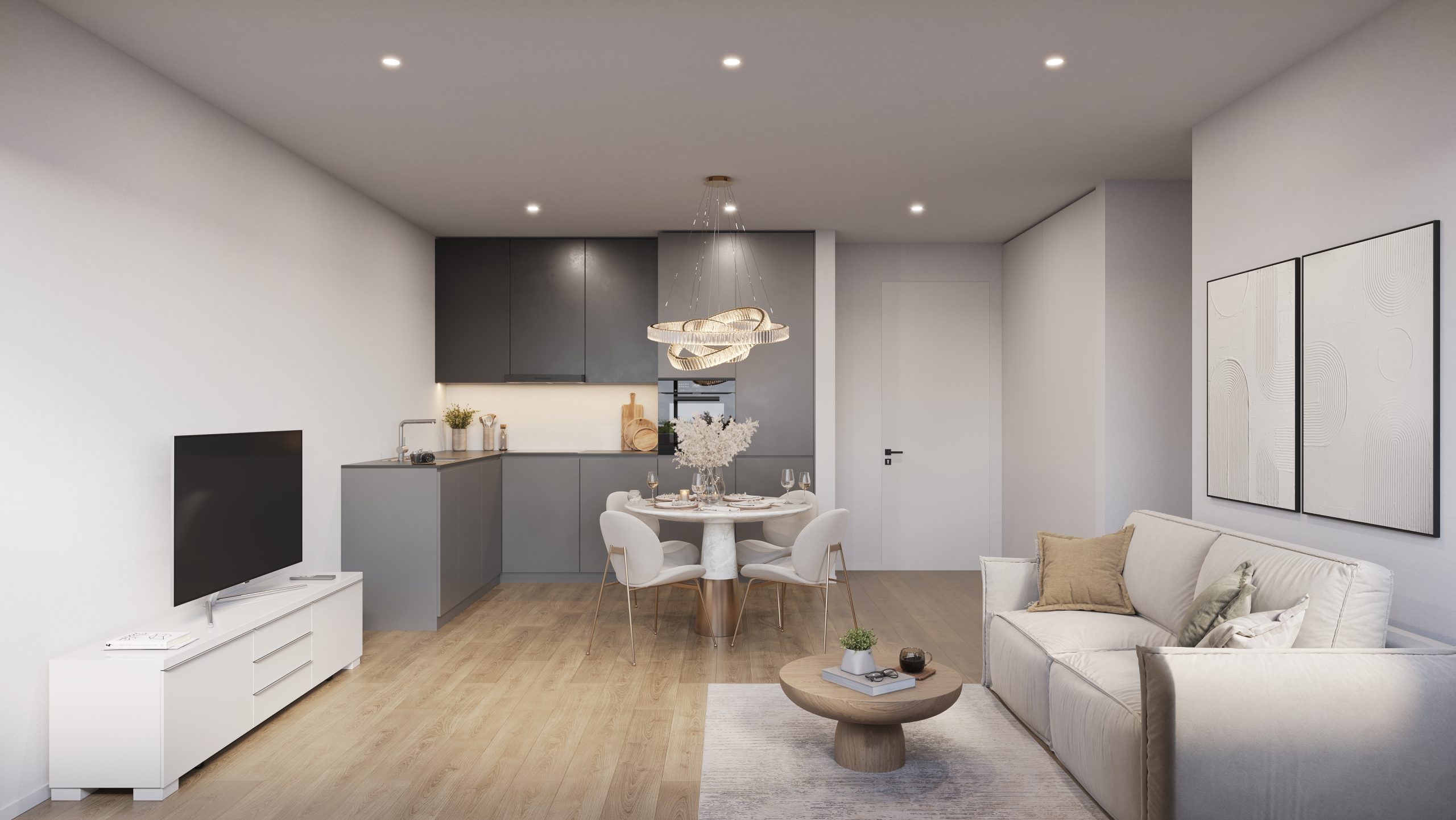 As you enter Loft F, you'll find an open layout that includes a large living area seamlessly connected to a modern kitchen, creating an inviting space perfect for relaxation or entertaining.