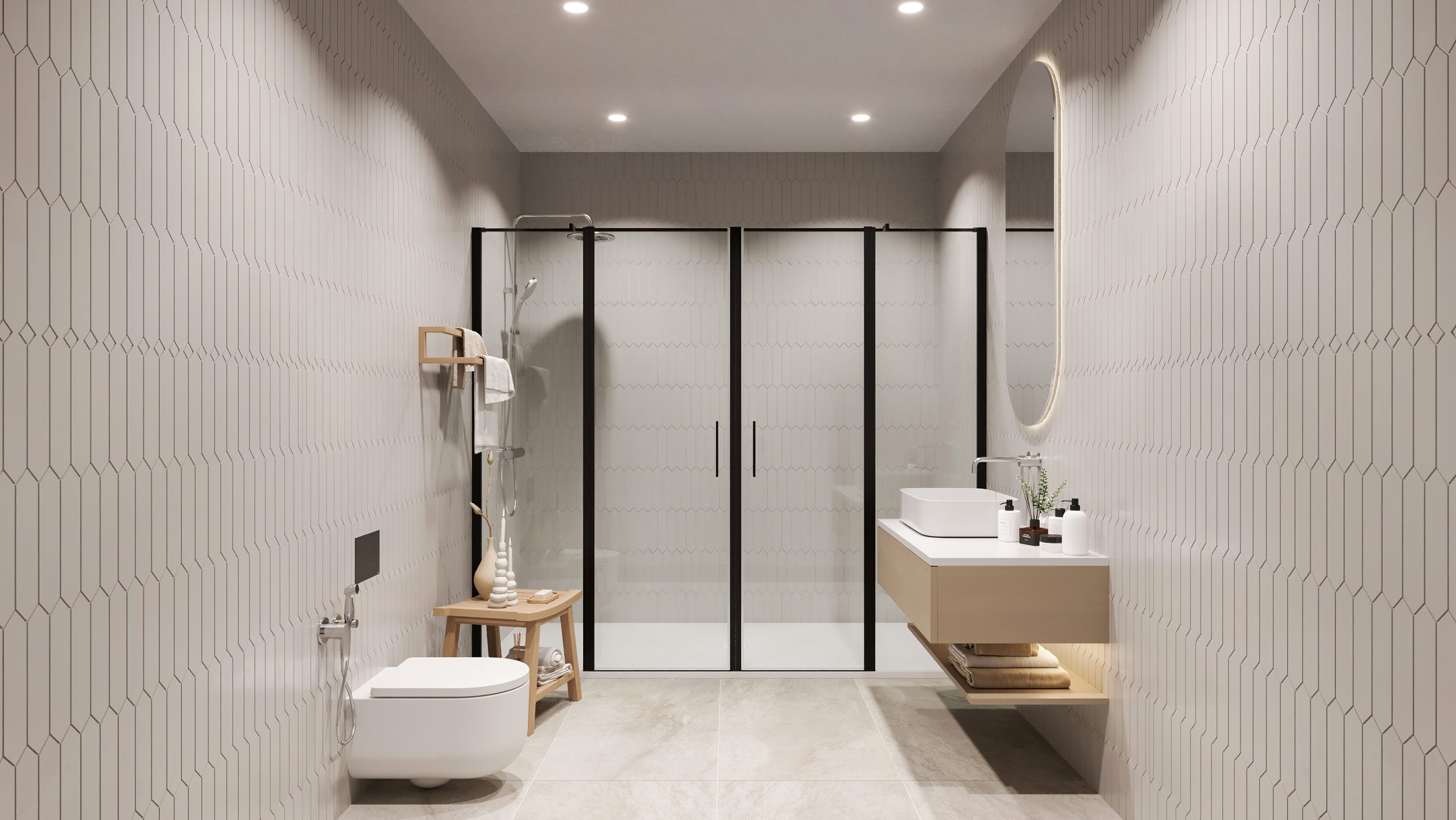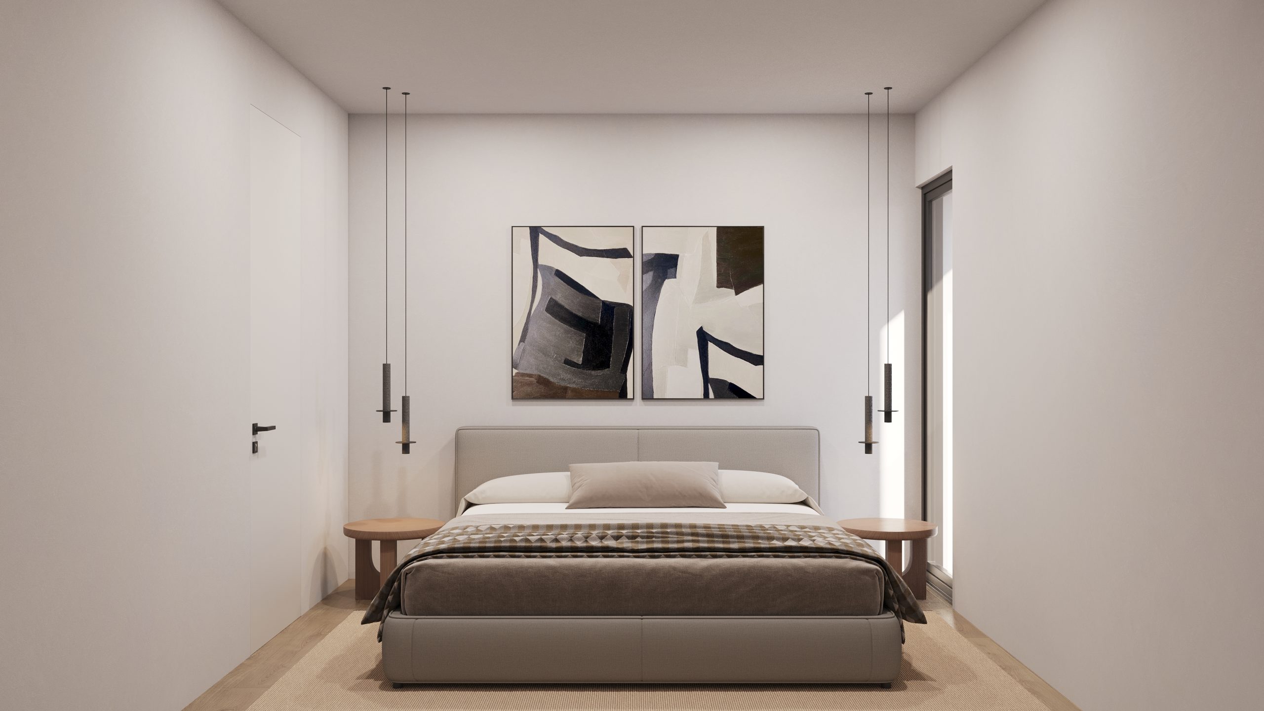 The bedroom offers a peaceful retreat with refined, natural finishes and an ensuite bathroom featuring luxurious, sustainable materials. Loft D embodies an elegant blend of comfort and modern design.